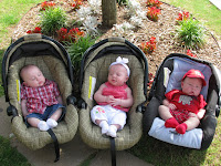 Well, we did it! We took the twins out of town for the long weekend! We went to my parent's lakehouse 2 hours away. It was just far enough! They did really well on the drive to and from, it's the longest they've ever been in the car. The lakehouse is in East Texas and it is beautiful out there. We live in the city, so it was nice to be out in the woods, with giant trees and deer coming up to the house. So neat!! It was very relaxing, I really didn't do much! Jimmy went fishing a few times and I would just stay at the house (babies are way to young to go out on the boat - that will happen soon enough if Jimmy has anything to say about it! haha). It was so nice to be able to relax while the babies napped. I would read, sleep or watch a movie. Things I do not get to do at home while they nap - there is always too much to do. We took them on a walk a couple times and it was so neat to watch them check out the "big wide world", as I call it. They were so curious, looking around at everything. We were also able to meet up with some of our very special friends, Kelly and Kevin, and their baby Grisham. He is about 6 weeks younger than the twins. We haven't seen them in about a year and it was so nice to get together and meet each other's babies. Here are some photos from the weekend!