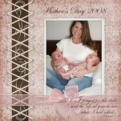 Well, my company is about kaput, so I will not be doing any part-time work for them anymore. I worked in the homebuilding business and as you all probably know, it's a disaster out there. I have been trying to come up with something I can do at home, while raising my twins. I just feel like we went through so much, and waited so long for these babies, that I am just not ready to hand them over to someone else to raise while I work. Daycare for twins is outrageous, so if I could just make some money from home that would be ideal. I've been experimenting with digital scrapbooking and I have become addicted! I am researching how to start my own "scrap for hire" business and I'm going to work towards that as my "home based business". There is so much I can do with it and I can't wait to get started and get some clients! (hint, hint) LOL Some of the options available are: baby books, birth announcements, sports season, vacation, retirement, milestone birthdays, wedding, honeymoon, graduation, invitations - I could go on and on!! Anyway, here are some of the samples I'm working on and I'll have several more by the end of the week... Thanks for looking! (Comments would be appreciated!) :-)