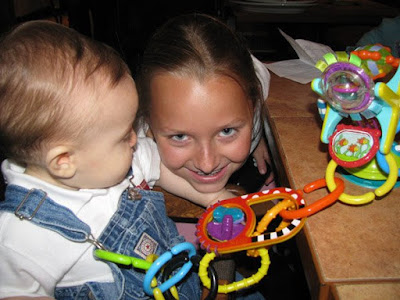 They sure do grow fast!! They are 9.5 months old now! Emerson is 19.5 lbs and 28.5 inches. Ryan is 18.5 lbs and 28 inches. They are pulling up in the crib now all the time, that's how we usually find them in the mornings - standing up talking to each other. They have also started "cruising", walking around the furniture while holding on. Wow, they are a handful! But, they really are at a fun age, and it is such a joy to watch them learning new things every day. Here are a lot of new pics we've taken lately, enjoy!
