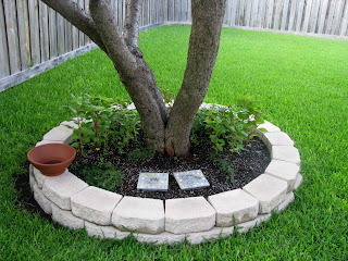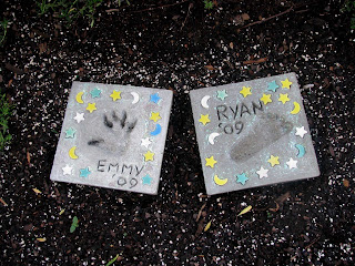 I found this kit to make stepping stones, so I bought it for the babies to make them for their daddy, for father's day. You will notice we have Emerson's hand print, and Ryan's foot print. We did Emerson's first and she placed her hand in the mix and just grabbed a handful and started flinging her hand around screaming! LOL I guess she didn't like the feel of it, or didn't understand what the heck I was mushing her hand into. We had to do a little reconstruction on the hand print because she grabbed all the way through. So, when it was Ryan's turn, I thought his foot print would be just as cute! When we are out back playing, they love to go over and put their hand and foot on them. They also know the words "moon & star", so they say that every time too!